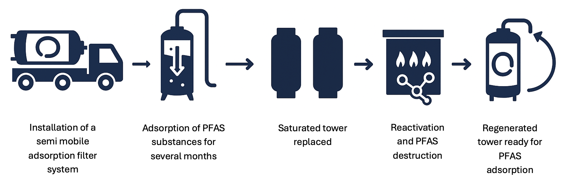AQUA PFAS FILTER is a semi-mobile, on-site purification system. When the tower is saturated, it’s replaced and sent to our facility, where PFAS are thermally destroyed — safely, cleanly, and permanently.